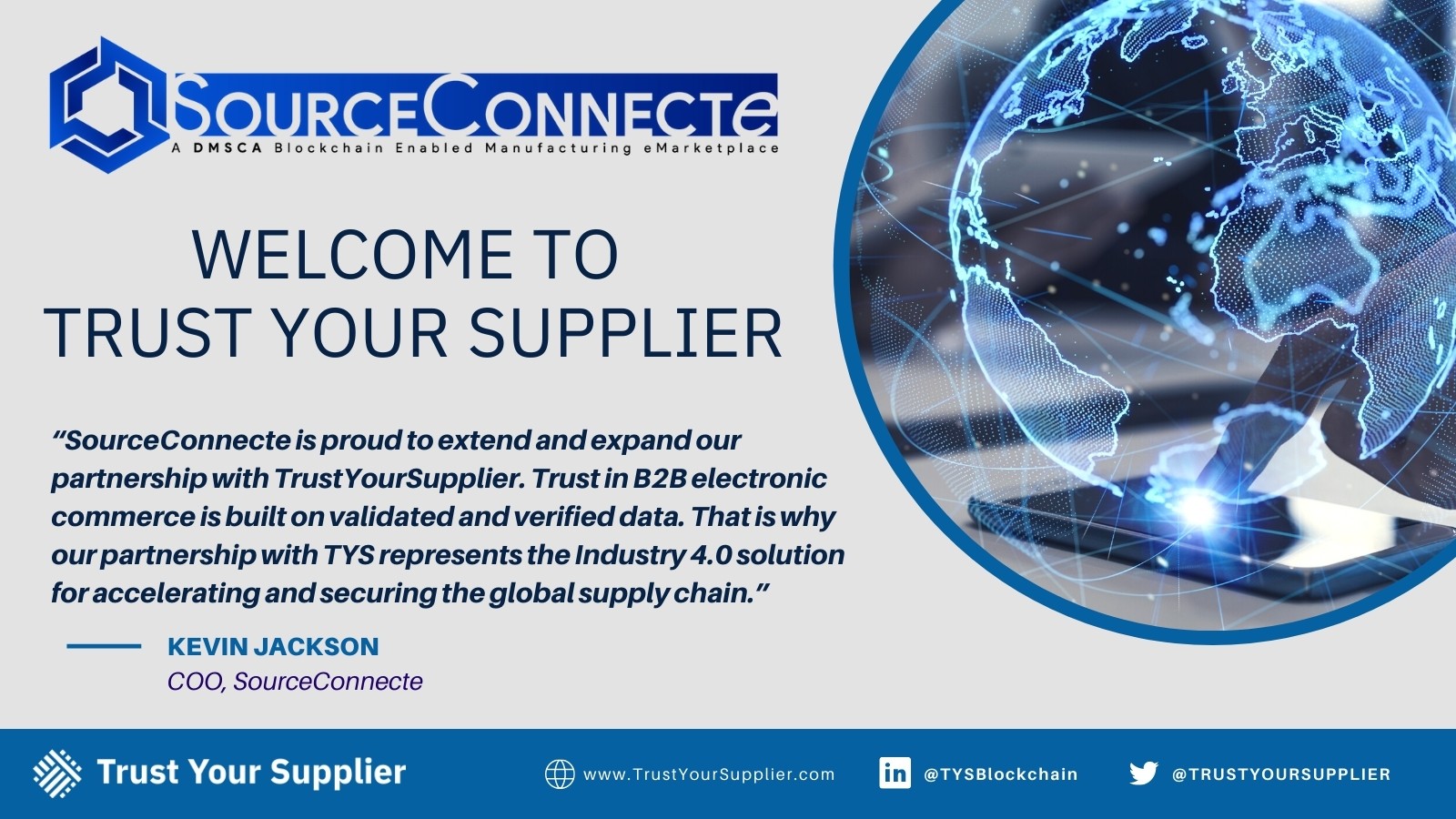 “SourceConnecte is proud to extend and expand our partnership with TrustYourSupplier. Trust in B2B electronic commerce is built on validated and verified data. That is why our partnership with TYS represents the Industry 4.0 solution for accelerating and securing the global supply chain.” – Kevin Jackson, COO, SourceConnecte